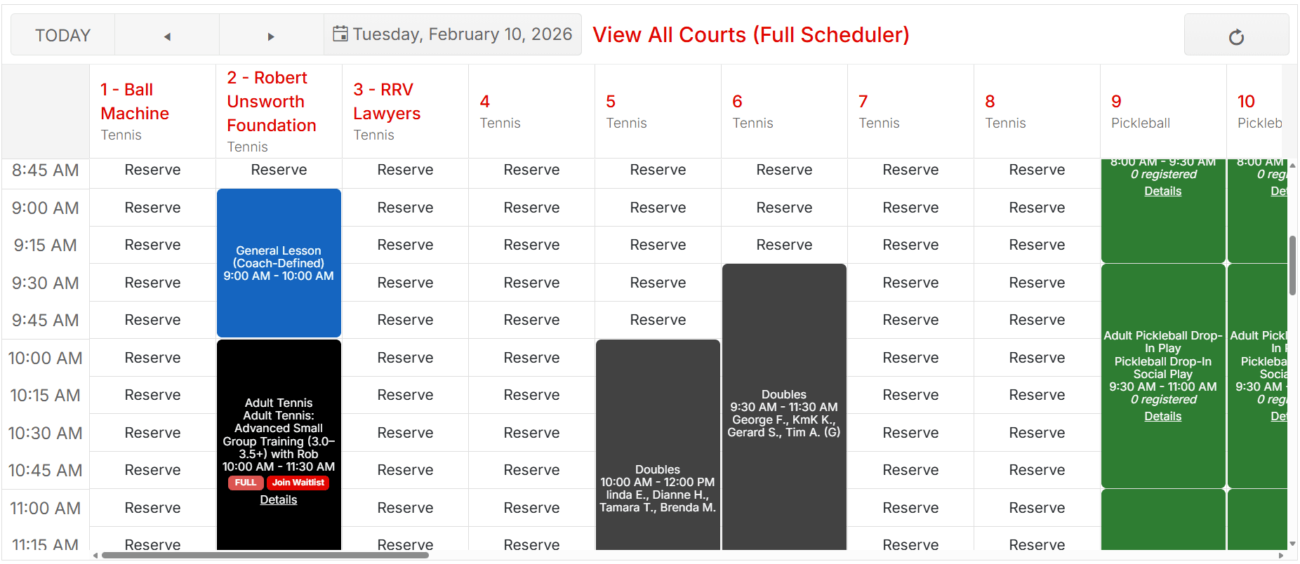 CourtReserve court reservation grid view