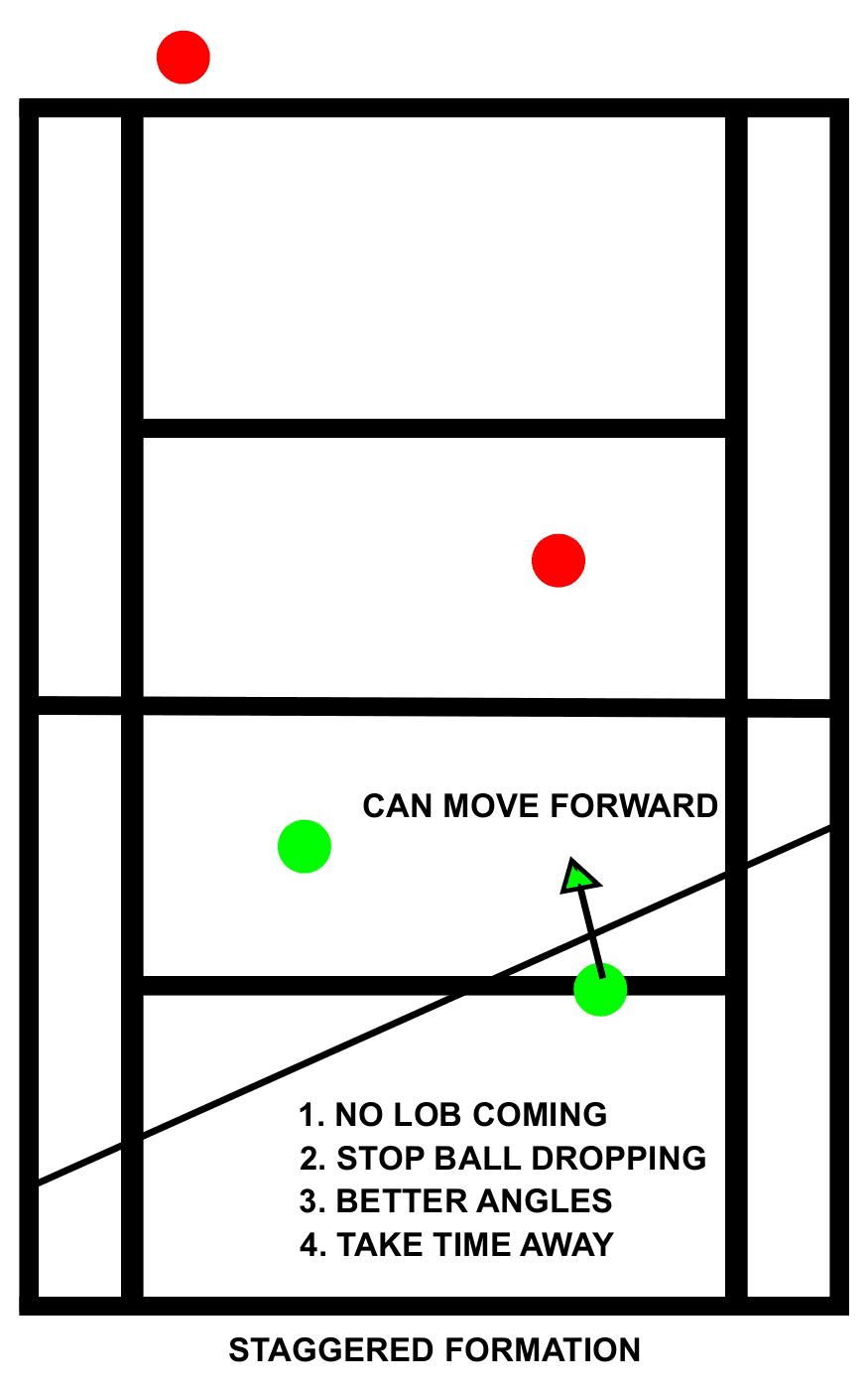 Nicely done. I especially liked the part about the staggered position so that the partner crosscourt from the ball can cover the lob over the more aggressive player who is up at the net.