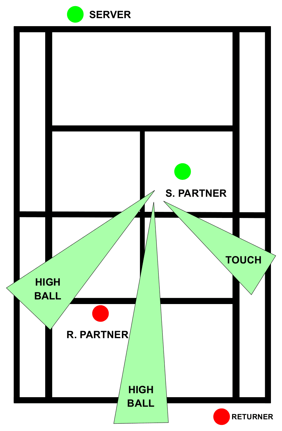 - Returner’s partner stands behind the service line at serve location 3 (deuce) and 6 (ad). This buys the returner more reaction time.