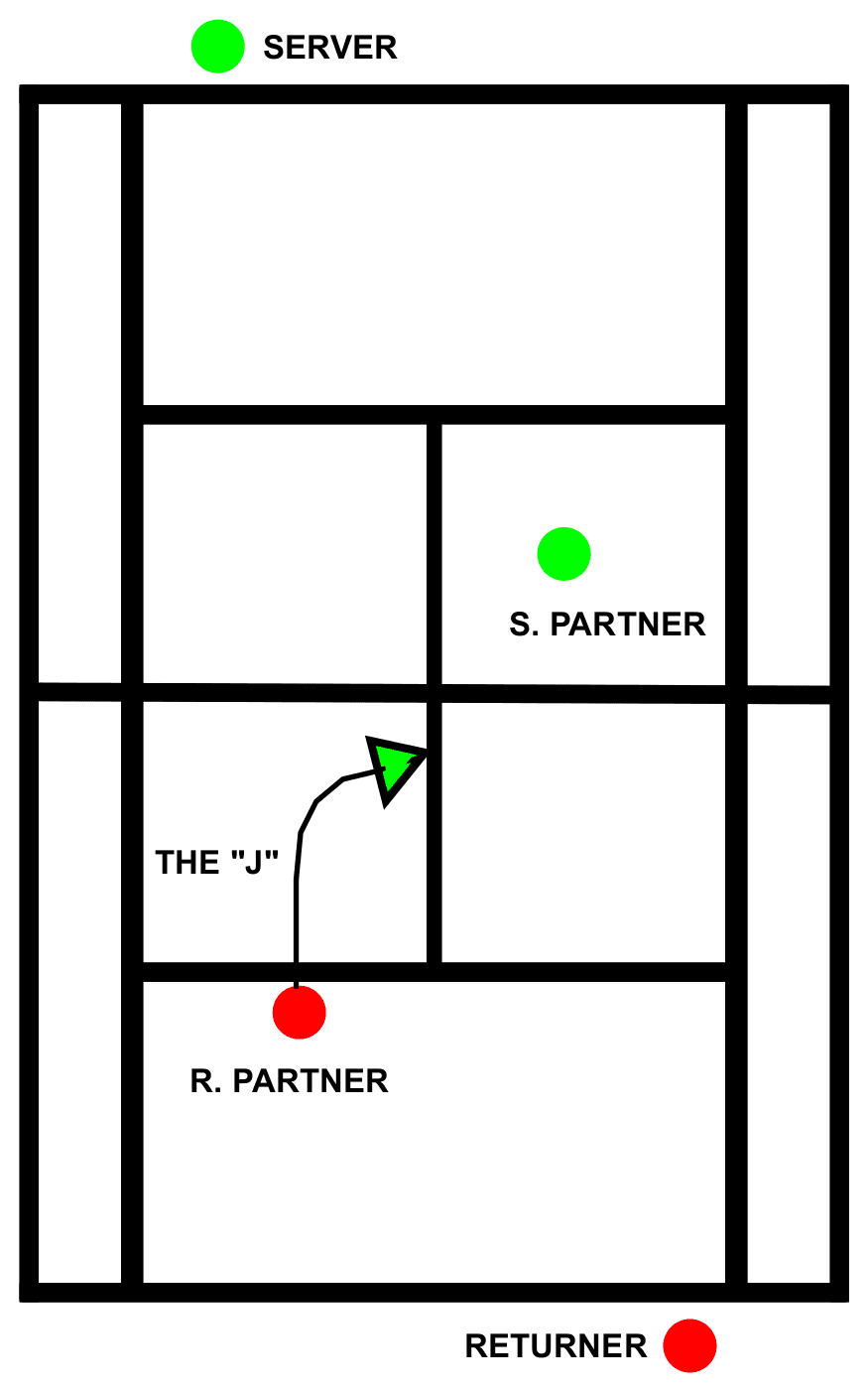 To execute “The J”, the returner’s partner goes forward faking to cover his side. However, right before the server hits the ball, returner’s partner cuts to the middle.